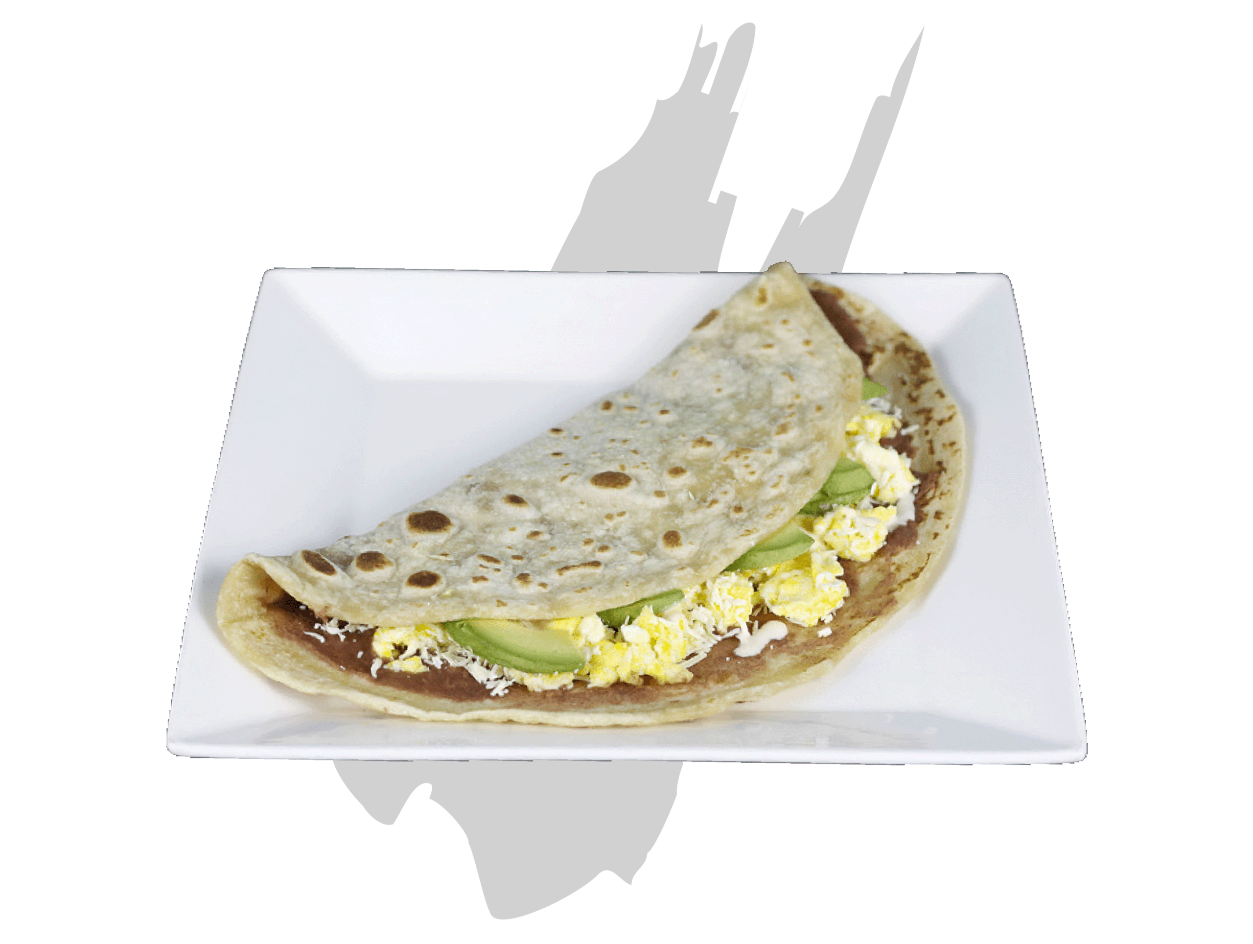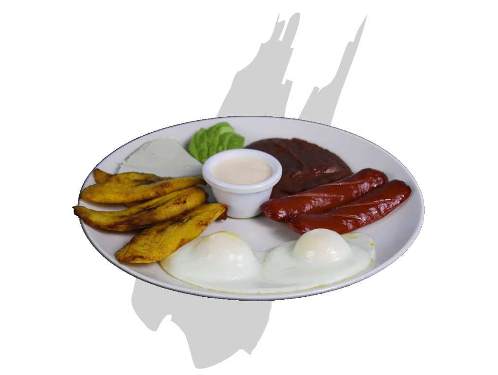 Huevo al gusto, frijoles, plátano, aguacate, salchicha, queso y crema. Tortilla: harina o maíz.